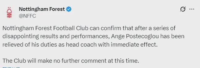 官方:諾丁漢森林宣布解雇主帥波斯特科格魯。在諾丁漢森林0-3輸給切爾西的幾分鐘后,森林就官方宣布了這一決定。