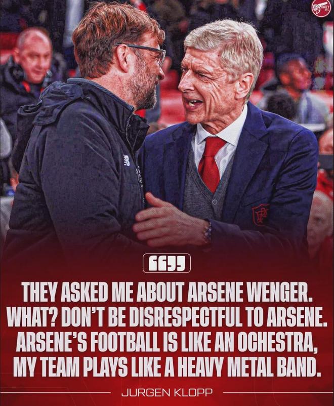克洛普說:“他們問我和溫格比較怎么樣,啥?別對(duì)溫格無禮……教授的足球就像管弦樂,我的球隊(duì)比賽風(fēng)格更像是重金屬樂隊(duì)?!?/p>