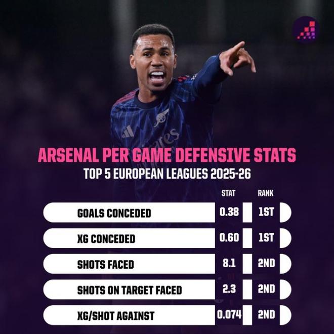 數(shù)據(jù)統(tǒng)計顯示,阿森納本賽季5項防守端關(guān)鍵數(shù)據(jù)均位列英超前二: